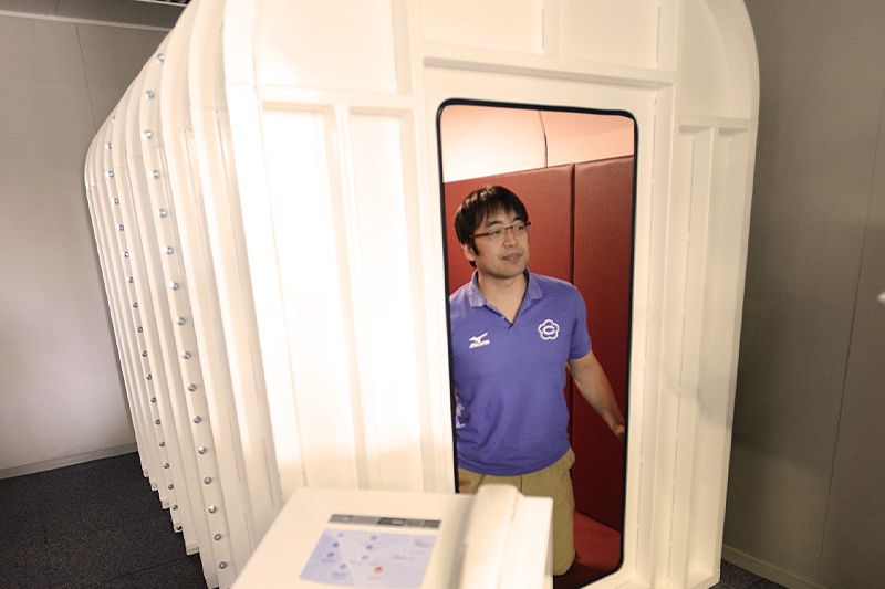 中京大学スポーツ科学部の荒牧勇教授が研究で使用する、高圧、低圧の2種類の酸素ルームが10月29日、豊田キャンパス15号館地階の実験室に設置された。酸素ルームの導入により、最先端のトレーニングコンディションの環境が整うことになる。荒牧教授は、内閣府の革新的研究開発推進プログラム「ⅠmPACT」の研究に参画し、「脳の健康プログラム」のグループ責任者の一人となっている。酸素ルーム内で高地などの環境を作り、学生アスリートたちのトレーニングやコンディショニングが脳に与える影響を計測し、得られた成果を一般の働き盛りの年齢層に応用していく。高圧ルームは疲労回復やけがの早期回復に効果があるとされている。設置された高圧ルームは奥行2.5㍍。数人が中に入れる大きさ。水深3㍍の環境を作り出せる。低圧ルームは高度3000㍍の高地トレーニングの環境を作り出せる。奥行5.2㍍あり、この中に自転車などのトレーニング器具も入れる。選手が高地トレーニングに合うかどうかもわかる。荒牧教授は「酸素ルームをトップ選手に使わせて、酸素ルームの効果、中で運動した時の効果、脳と疲労との関係などを確かめ、一般の人への応用を考えていく」と話している。酸素ルームは28日、29日の2日がかりで設置作業が行われた。29日は、豊田キャンパスを練習拠点にしている十種競技の中村明彦選手(2012年度体育学部卒、スズキ浜松AC)が訪れ、設置されたばかりの高圧ルームの使い方などを確かめました。